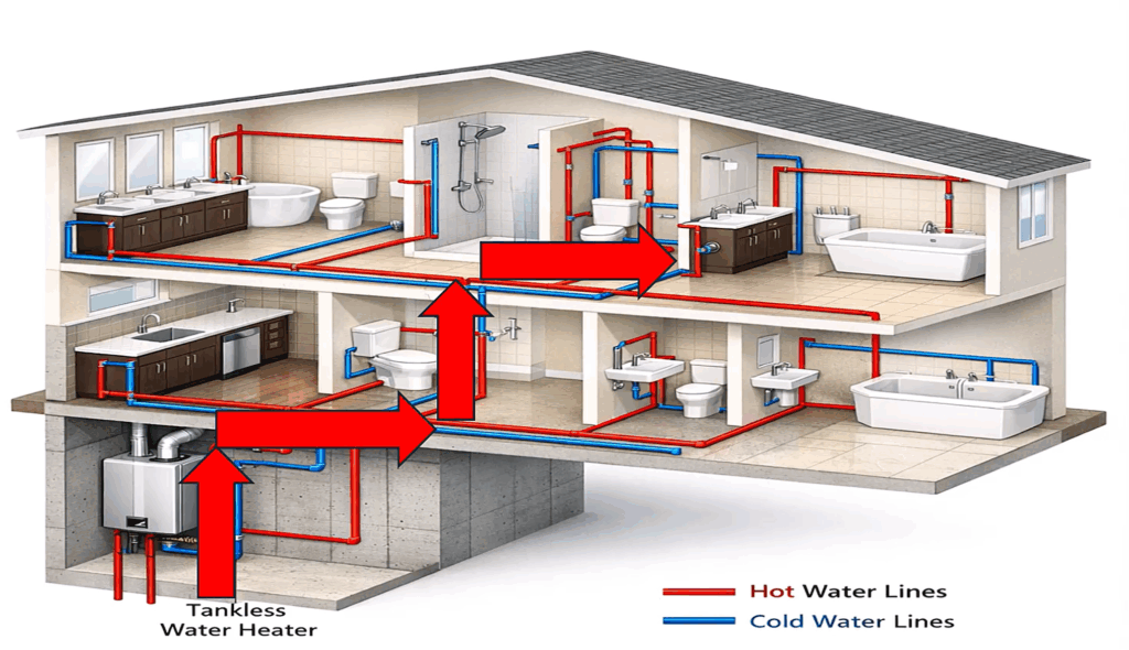 Take a look at the image below. When the recirculation pump runs on its scheduled program, the tankless heater is already firing and hot water has reached the furthest bathroom group (usually on the second floor). As a result, other bathrooms, kitchen sinks, and fixtures receive hot water much faster—cutting wait times by roughly 75–80% and addressing a common concern about tankless systems. Because the farthest group has been supplied and the heater is actively processing hot water, warm water is already distributed through the piping network, which generally removes the need for additional pumps at other fixture locations.